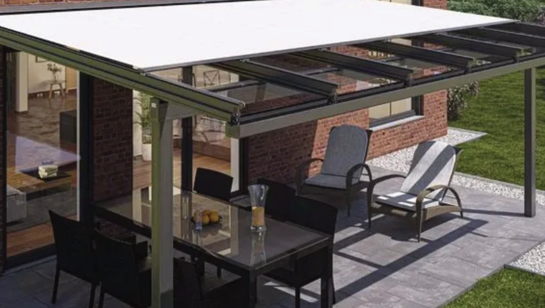 - Kombinierter Schutz – Glasdach schützt vor Regen, Markise vor Sonne.